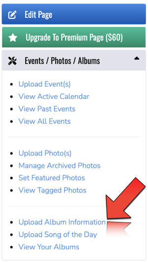 - Clicking “Upload Album Information” from the "Events / Photos / Albums" dropdown menu (see right) from your musician's page.