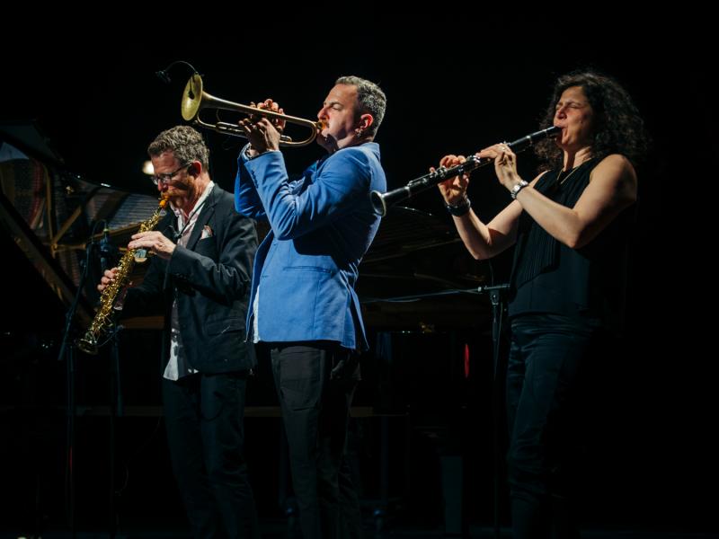 "I had this urge to figure out how to work with the things a big band can do really well, natively," Lev-Ari shares. "A good big band can swing and play together and have an amazing ensemble sound that punches you in the gut. So the thought was to take that and infuse that with the things that I also find interesting about music that sort of drove me away from big bands for so longmaybe that they're naturally a little too big to get this very fine kind of interaction between the musicians. And in a way, the 3 Cohens is the perfect agent to inject into a big band to promote this by example. Because you have this crazy frontline that is the definition of interaction. That's what they do. That's the essence. And the goal in constructing the program was to create pockets within the musicin the arrangementthat allow the big band to take example from the front line and have that feeling seep into the playing of the big band without me having to explain it."